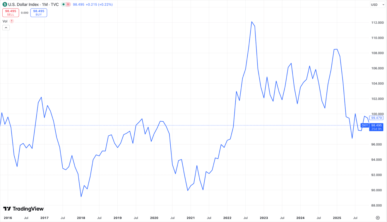 One of the most common misconceptions we see among investors is the belief that a “strong dollar” means their money is holding its value. That misunderstanding usually comes from watching the U.S. Dollar Index, commonly referred to as DXY.